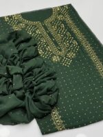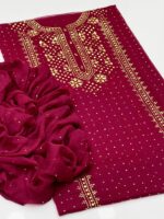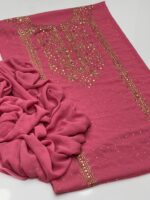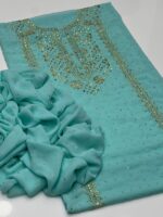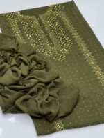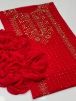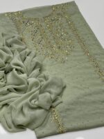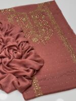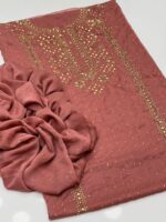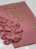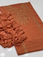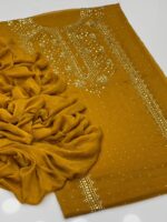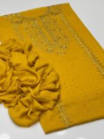This beautiful 2-Piece Unstitched Suit features exquisite handmade golden mukesh work on a soft krinkle chiffon kurta-style shirt, giving a rich and graceful appearance. Paired with a stylish chatta dupatta, this outfit is perfect for festive gatherings and special occasions.